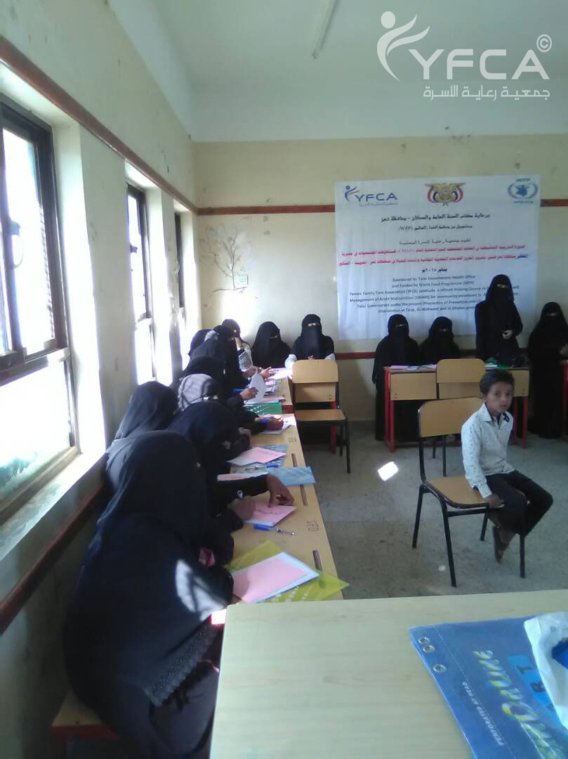 عقد في مديرية المعافر بمحافظة تعز لقاء تنشيطي ل 31 متطوعة مجتمعية في مجال معالجة سوء التغذية المتوسط و ذلك ضمن برنامج تعزيز الخدمات الصحية والوقائية المنقذة للحياة في محافظات تعز – المحويت – الضالع. البرنامج تنفذه جمعية رعاية الأسرة (YFCA) بتمويل من برنامج الغذاء العالمي (WFP)