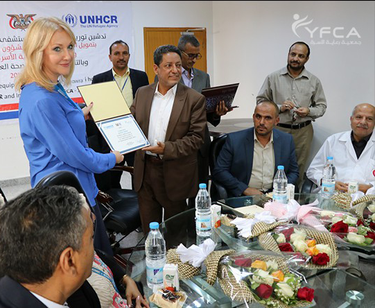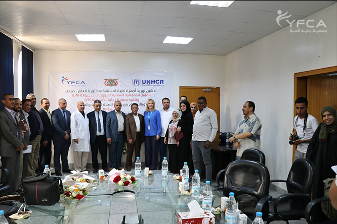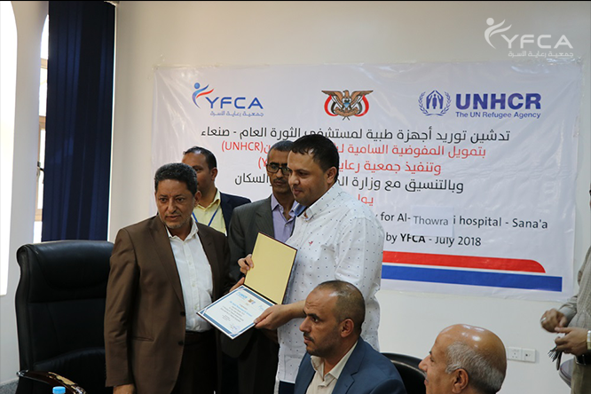 أقيم بمستشفى الثورة العام بصنعاء حفل تسليم معدات و أجهزة طبية حديثة لوحدة العناية المركزة في قسم أمراض النساء والولادة بالمستشفى . هذا النشاط جزء من الخدمات الصحية المقدمة من مشروع حماية اللاجئين بتمويل من المفوضية السامية للأمم المتحدة لشؤون اللاجئين (UNHCR) وتنفيذ جمعية رعاية الأسرة ( YFCA)، وتشمل تلك المعدات "أجهزة مراقبة المرضى ، آلات الشفط المحمولة ، مضخات التسريب ، السرير الكهربائي ، وأجهزة التهوية " . شارك في الحفل ممثلون عن المفوضية السامية للأمم المتحدة لشؤون اللاجئين وجمعية رعاية الأسرة ، ومستشفى الثورة العام و أمانة العاصمة ..