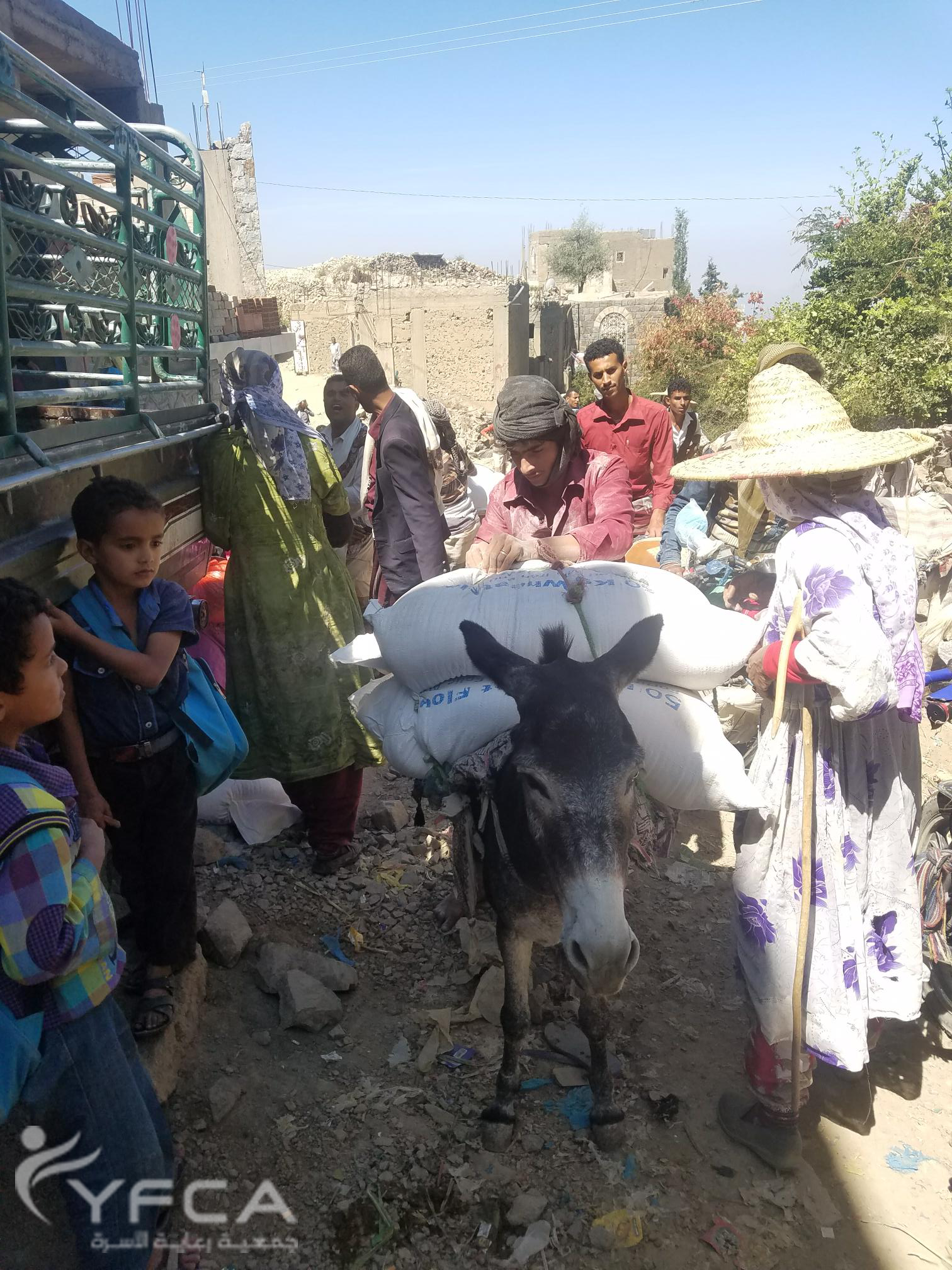 أنهت الفرق التابعة لجمعية رعاية الأسرة (YFCA) عملية التوزيع )الدفعة السابعة) للسلال الغذائية في مديرية مشرعة وحدنان بمحافظة تعز لعدد 20490 مستفيد ، يقوم الأهالي بالأستعانة بالحمير في نقل المساعدات الغذائية المعطاه لهم وذلك لوعورة بعض مناطق المديرية والتي لاتصل إليها السيارات .ضمن مشروع توزيع المساعدات الغذائية الطارئة في محافظة تعز التي تنفذه الجمعية بتمويل من برنامج الأغذية العالمي (WFP) والذي يستهدف الفئات الأشد فقراً في عدد من مديريات المحافظة.