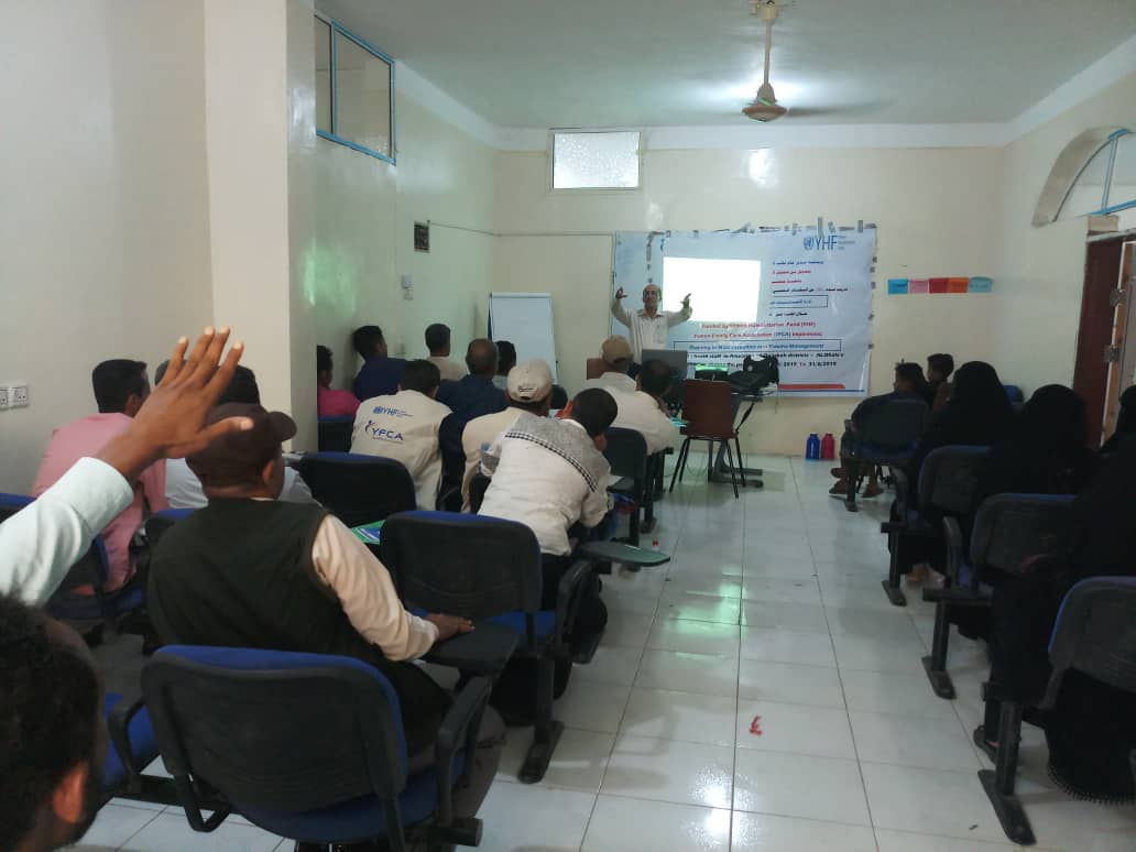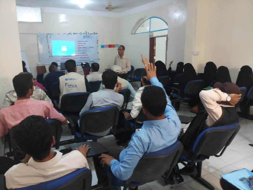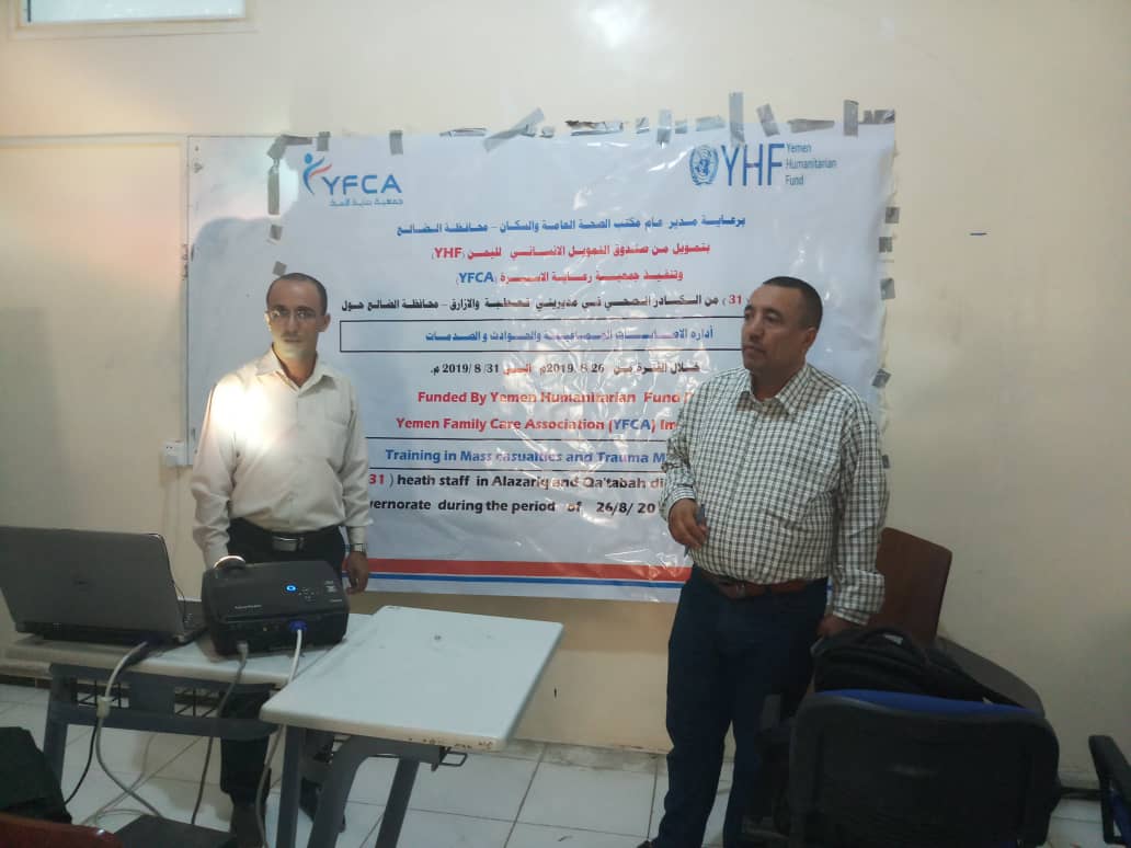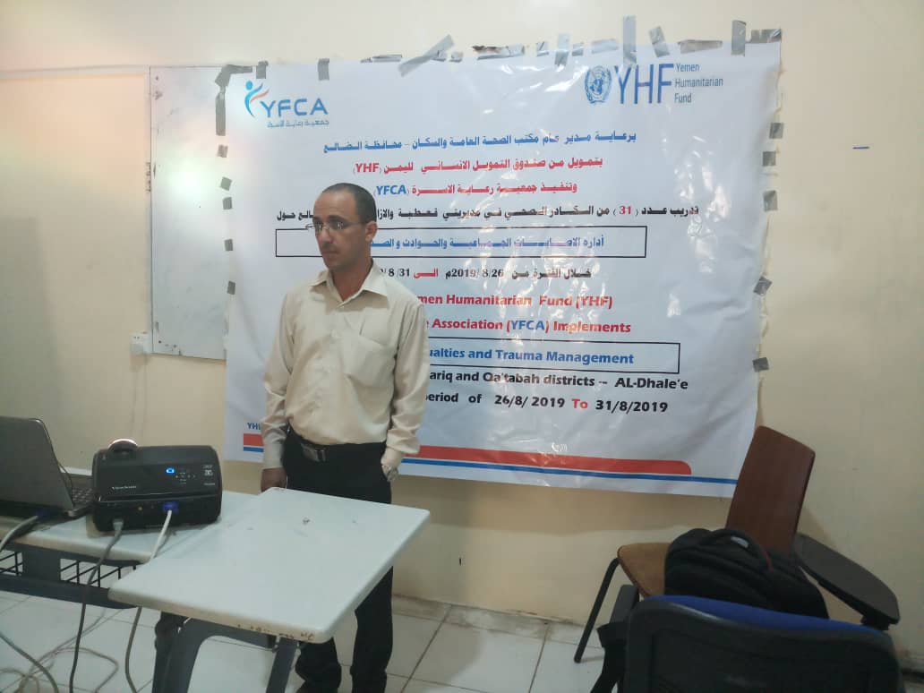 نظمت جمعية رعاية الأسرة (YFCA) في مديريتي قعطبة والأزارق بمحافظة الضالع دورة تدريبية حول إدارة الحوادث و الصدمات لعدد 44 من الكادر الصحي في المديريتين و ذلك خلال الفترة من 8/26/ 2019 إلى 8/31 / 2019. وذلك ضمن أنشطة مشروع توفير التدخلات الصحية والمياه والاصحاح البيئي في محافظتي حضرموت والضالع مشروع رقم #11813.