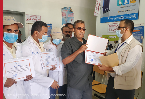 The YFCA Al-Dhalea’s office honored on Tuesday December 14, 2021, Dr. Muthana Saeed, Director of Health in Qa'atabah and number of health workers at Al-Salam Hospital and the mobile clinic team in the district with certificates of appreciation.