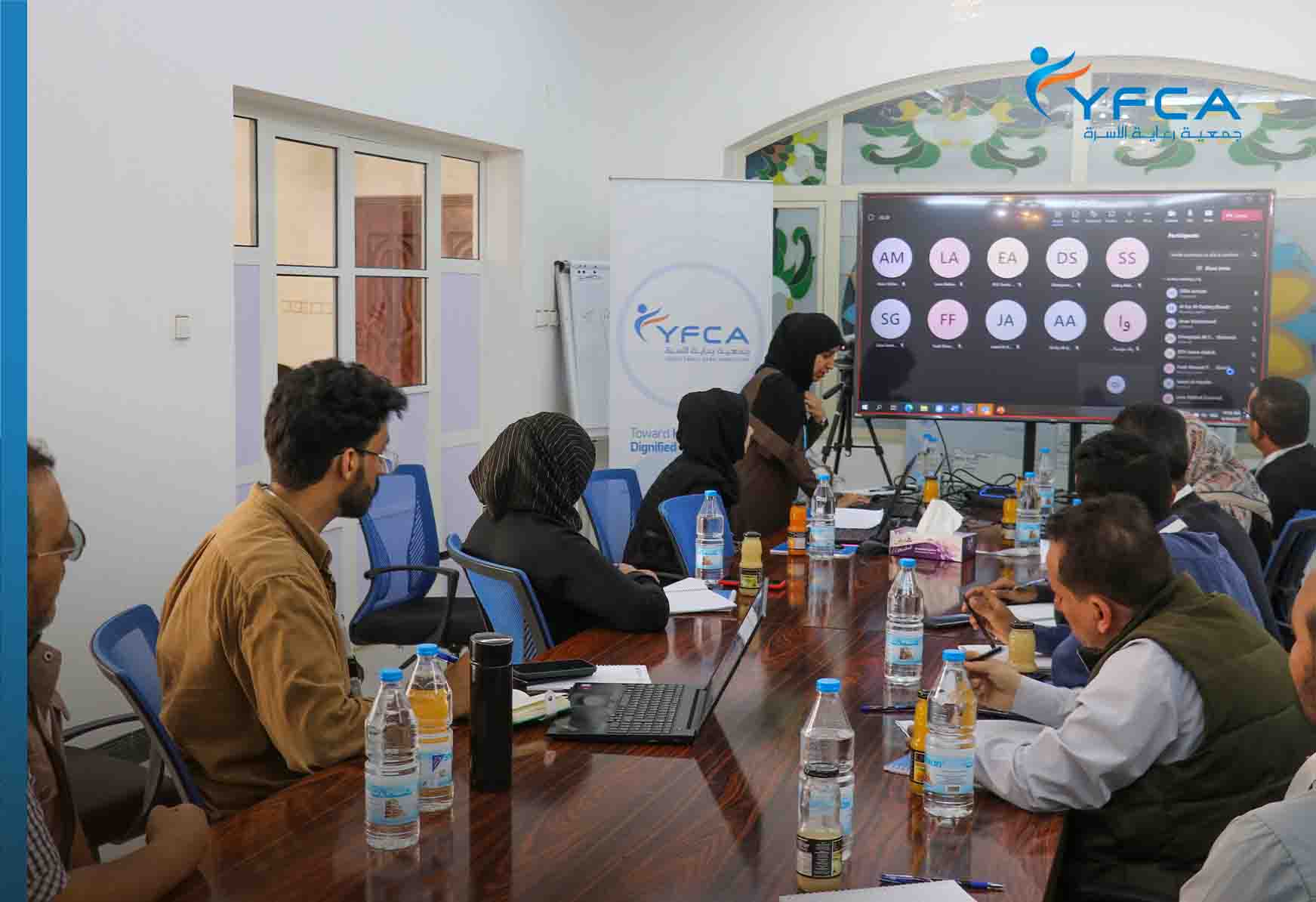 Within YFCA's vision of strengthening the coordination and communication lines in the humanitarian field and amongst the humanitarian actors, YFCA embraced the WASH cluster monthly meeting of Sana'a Sub-National hub, hosting all partners of the same hub. The meeting was attended physically and via online by the WASH cluster partners who intervene in the areas located under Sana'a hub. In the same context, the meeting concluded with the transition of the WASH cluster co-coordinator's responsibilities from Ms. Olfat Jumaan, the previous co-coordinator, to the YFCA representative Eng. Eman Modhafar.