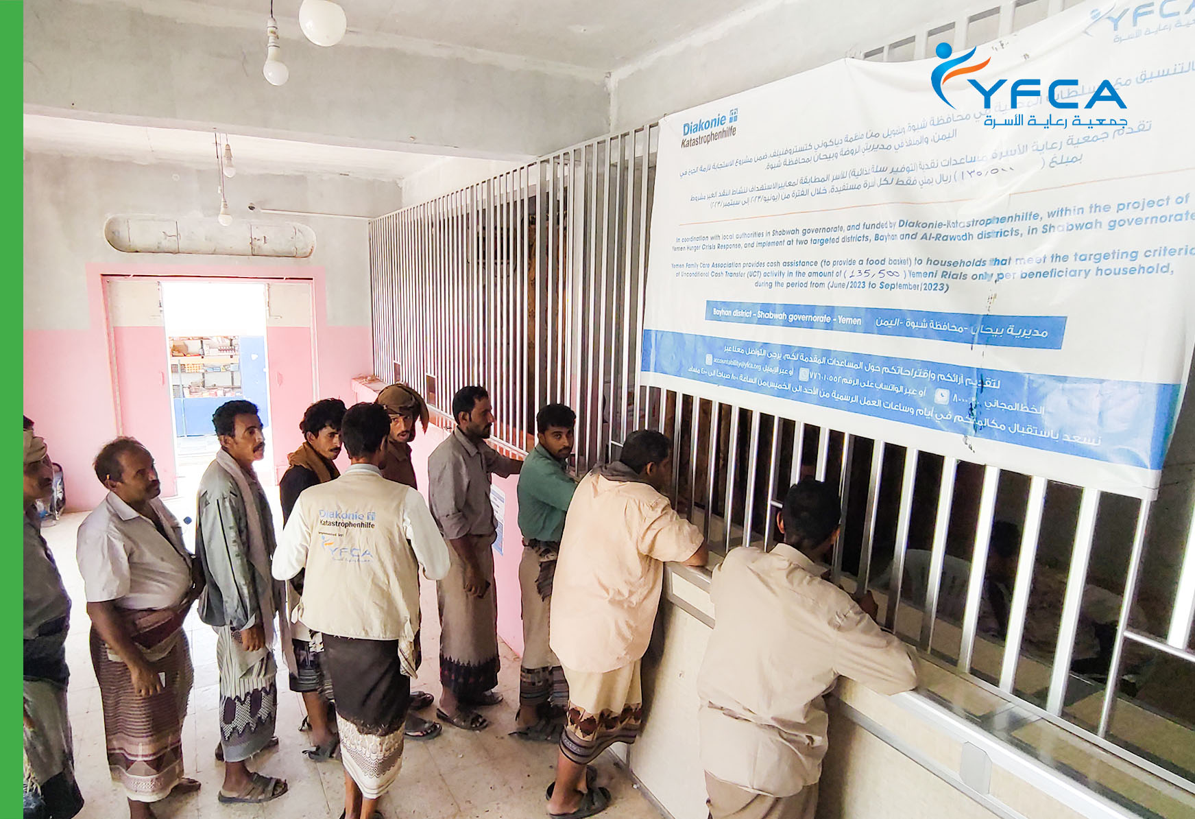 وزعت جمعية رعاية الأسرة الدفعة الرابعة من المساعدات النقدية على 200 أسرة محتاجة في مديرية بيحان بمحافظة شبوة، وذلك ضمن إطار جهودها لمواجهة أزمة الأمن الغذائي في اليمن. تعد المساعدات النقدية جزءًا من نشاط التحويلات النقدية غير المشروطة، وهو أحد الأنشطة في إطار المشروع الجاري للاستجابة لأزمة الجوع في اليمن، بتمويل من .DKH