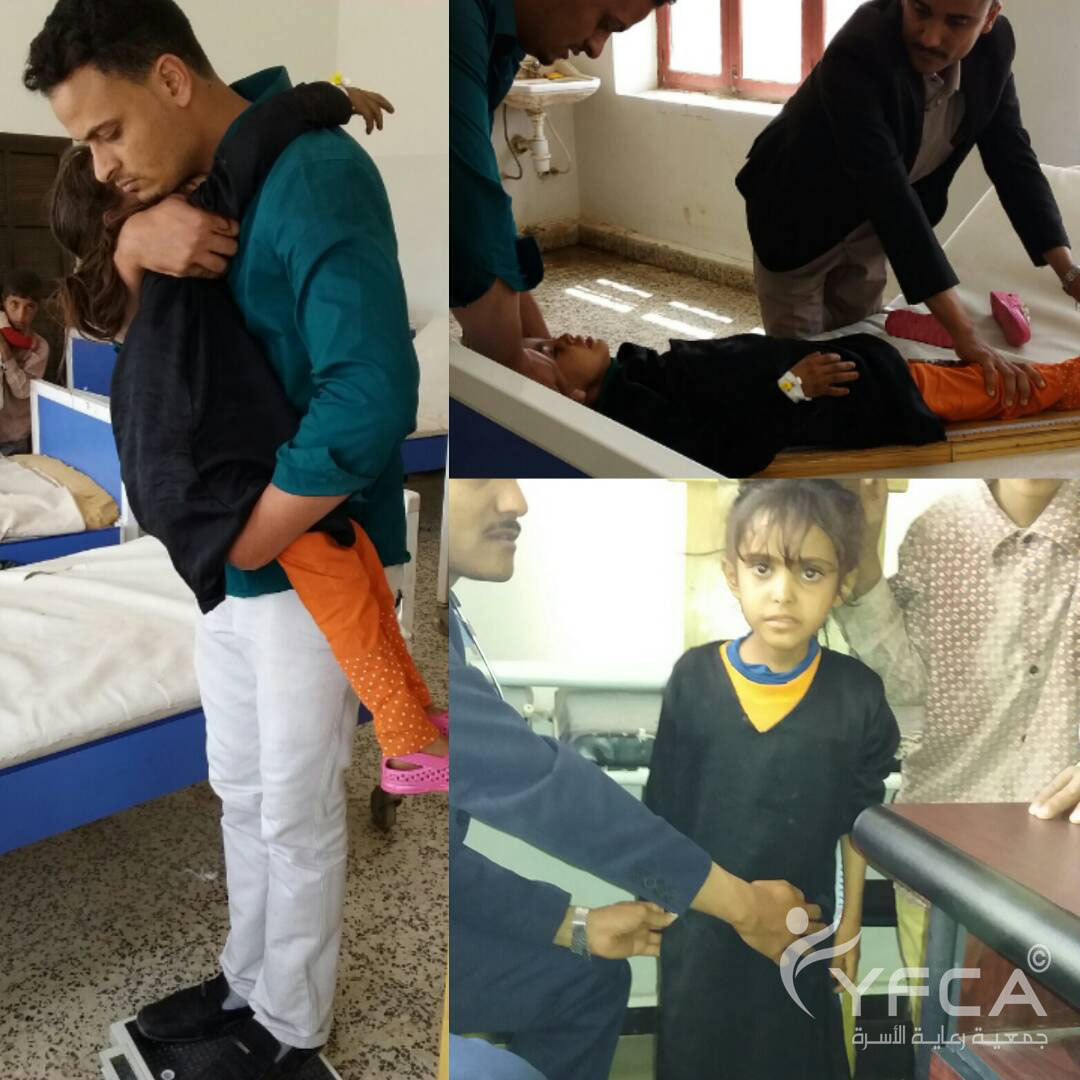 الطفلة عائشة تتمكن من الوقوف و المشي مجددا بعد نجاح فريق جمعية رعاية الأسرة (YFCA) في معالجتها من حالة سوء التغذية الحاد الوخيم التي كانت تعانيها والتي سببت لها عجزا في الحركة .. مستشفى 22 مايو بمدينة جبن بمحافظة الضالع ضمن مشروع الاستجابة الشاملة والمتكاملة لمعالجة سوء التغذية الذي يستهدف محافظتي الضالع وصعدة الذي تنفذه الجمعية بتمويل من وكالة التنمية البريطانية (DFID)وبالشراكة مع ( ACTED)